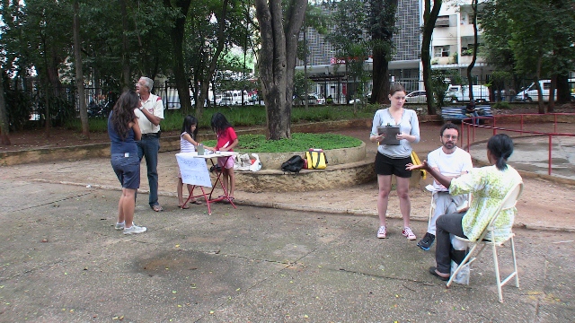 A intervenção consiste na construção de um espaço de diálogo através da presença e interação do grupo no contexto urbano da cidade de São Paulo. Para tal ação, o coletivo monta um ambiente convidativo onde ficam dispostos os seguintes elementos: cartaz com indicação da ação (nome da intervenção), uma mesa, cadeiras, material gráfico e equipamentos para captura de imagem (câmeras fotográficas e de vídeo).